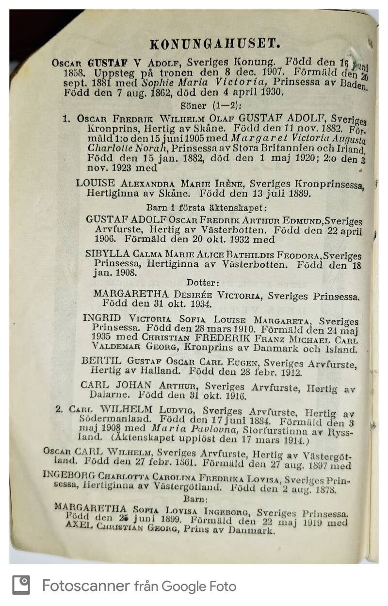 Det första och viktigaste i almanackan är naturligtvis kungahuset, inklusive vilken som är kung och drottning, samt tronföljdsordningen. Därför återfinns denna information naturligtvis på insidan.
